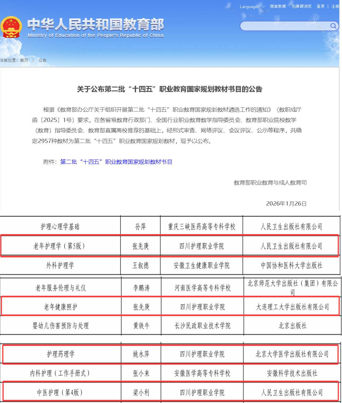 近日,教育部正式公布《第二批“十四五”职业教育国家规划教材书目》,我校共有4部教材成功入选,分别是《老年护理学(第5版)》《老年健康照护》《护理药理学》《中医护理(第4版)》。这是继6部教材获评首批“十四五”职业教育国家规划教材之后,我校在教材建设方面的又一重要突破。