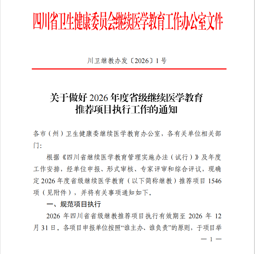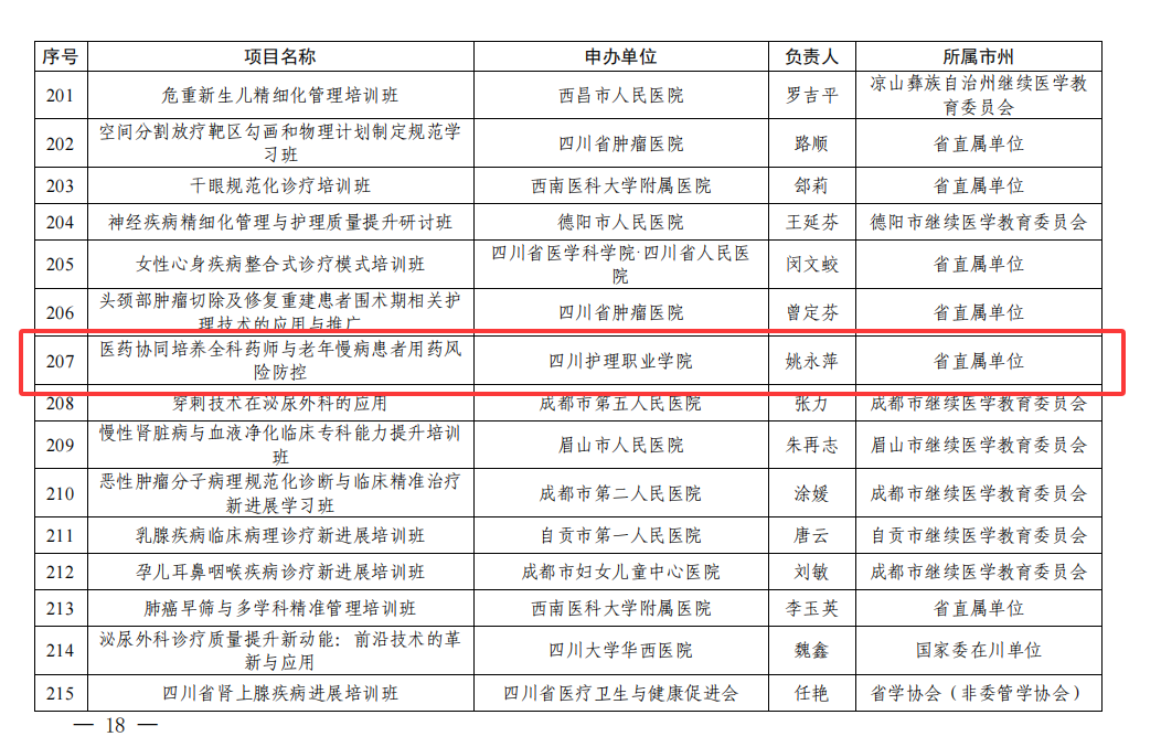 近日,四川省卫生健康委员会继续医学教育工作办公室正式公布2026年度省级继续医学教育推荐项目,我校院长姚永萍牵头申报的“医药协同培养全科药师与老年慢病患者用药风险防控”项目成功入选。该项目是本年度1546项省级继教推荐项目中唯一由高职院校申报的项目,更是我校双高建设中药学专业聚焦民生需求、深化产教融合的标志性成果。
