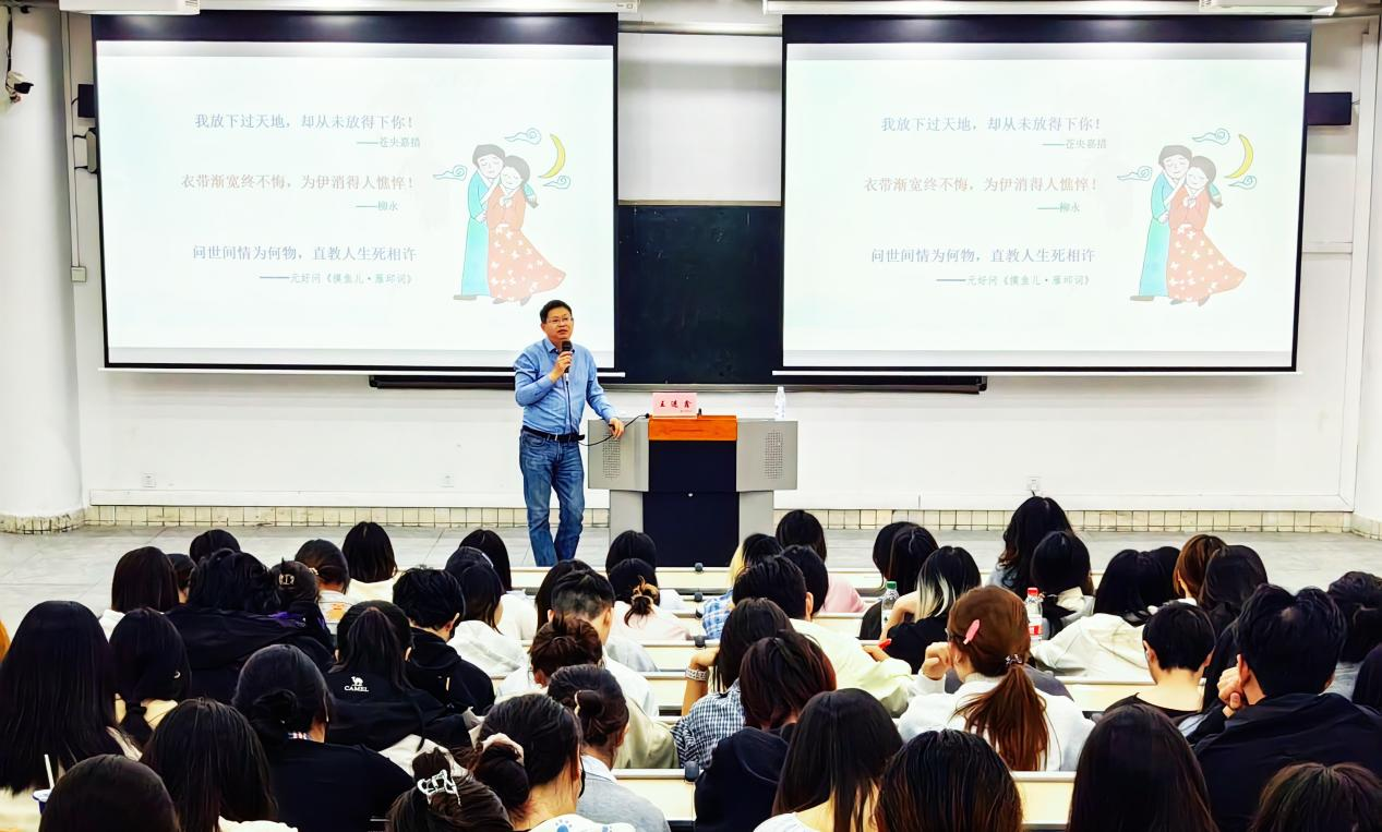 本次活动特邀成都工业学院教授、四川性社会学与性教育研究中心学术委员会主任王进鑫担任主讲。王进鑫紧扣大学生成长中的现实议题,立足“发乎情,止乎礼”“以义导利、以礼节情”等中华传统核心理念,融合心理学理论与真实案例,从“爱情的真谛”“如何经营爱情”“性的健康与安全”三个维度展开深入讲解。他重点剖析了情感中的风险与责任、性健康误区及自我保护策略,并对“人格识别”“失恋后的自我成长”等现实议题进行了深入阐释。王教授强调,传统文化所倡导的“慎独”“知止”“自重”等修养功夫,是构建健康人格的基石,引导同学们在尊重与责任中实现自我成长。